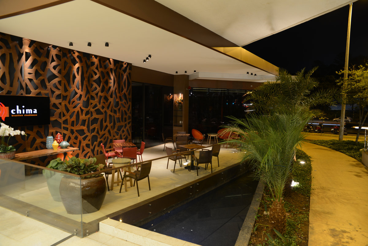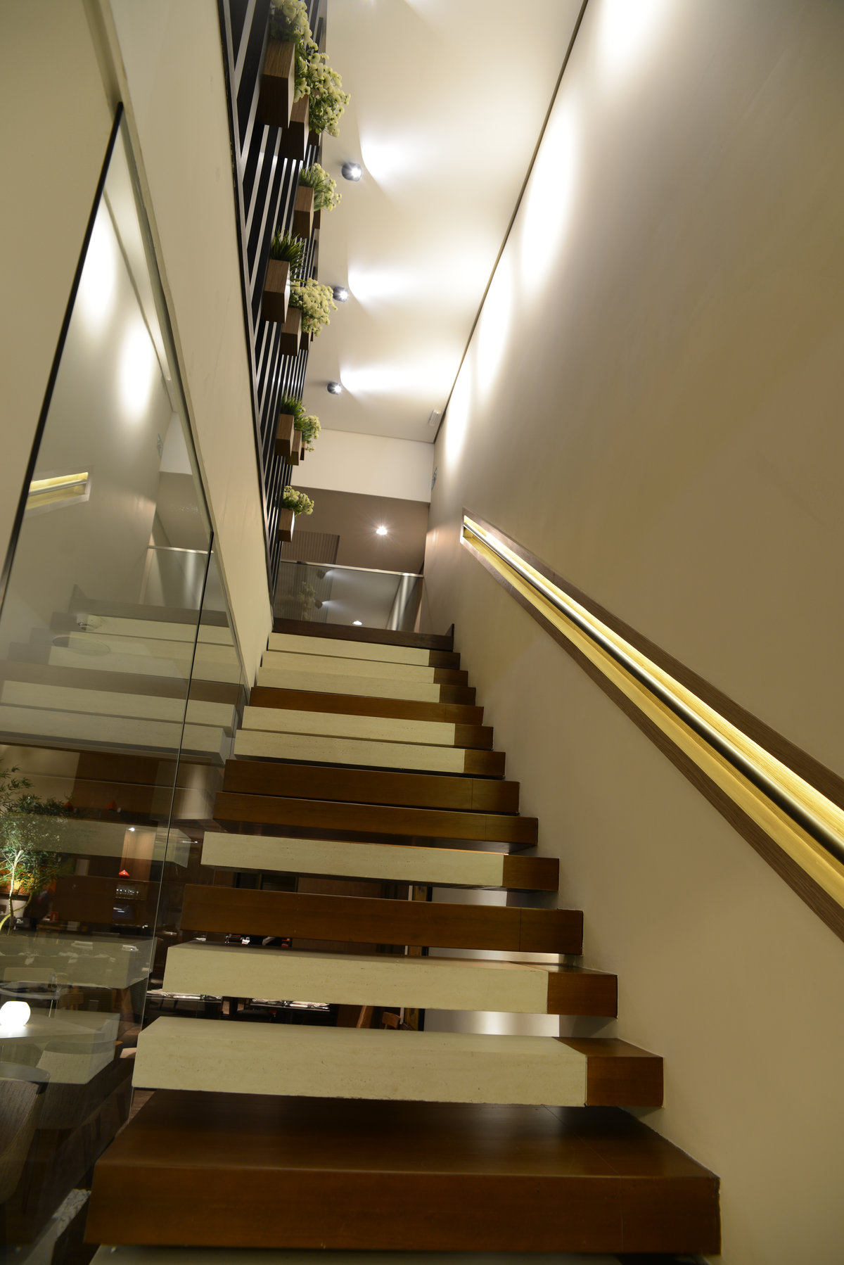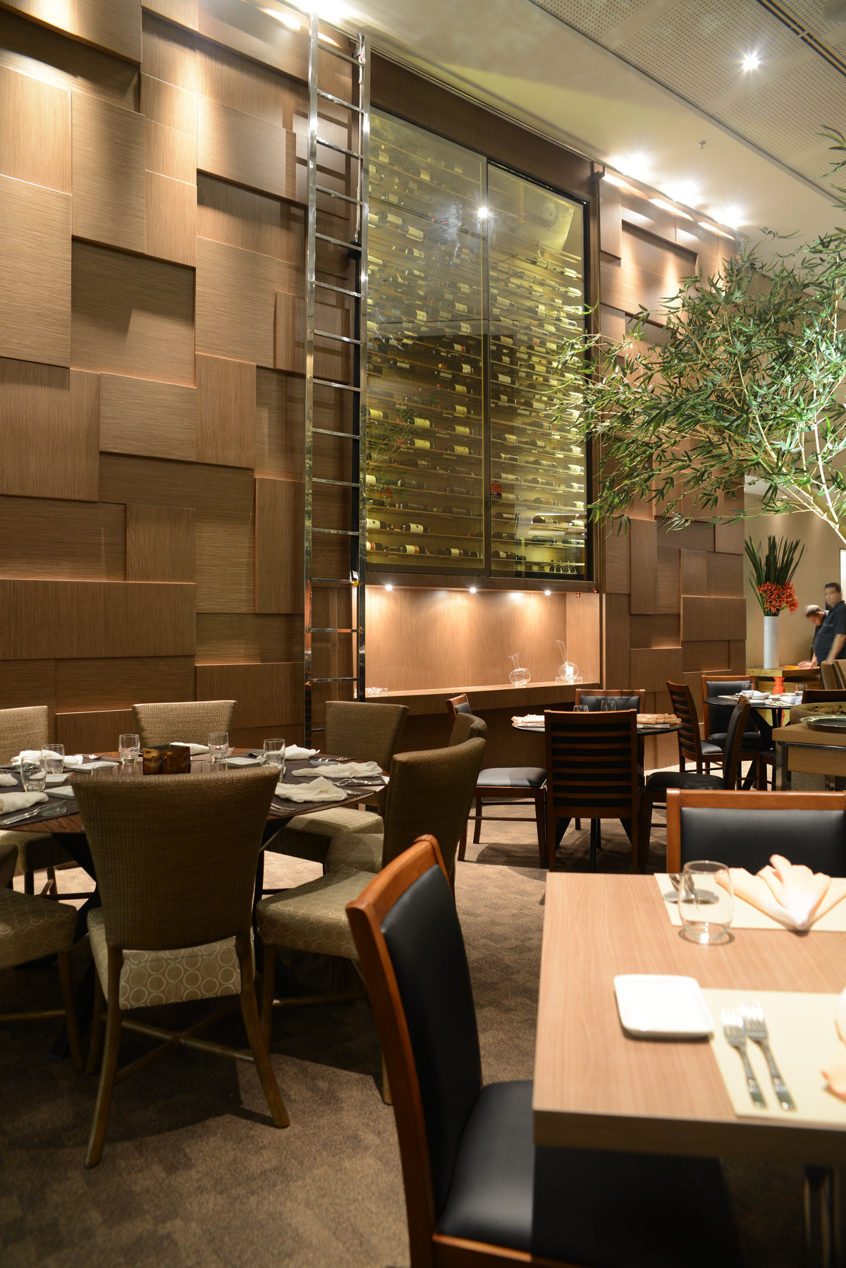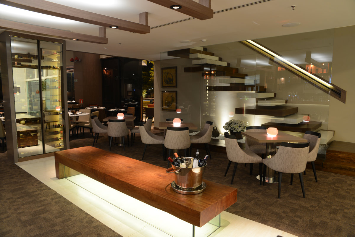 A iluminação indireta, no forro e em detalhes como no corrimão, embutidos cuidadosamente colocados para criar uma atmosfera intimista e acolhedora, tudo pensado para experiências gastronômicas prolongadas.