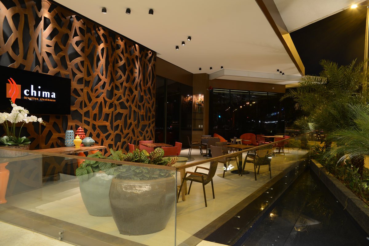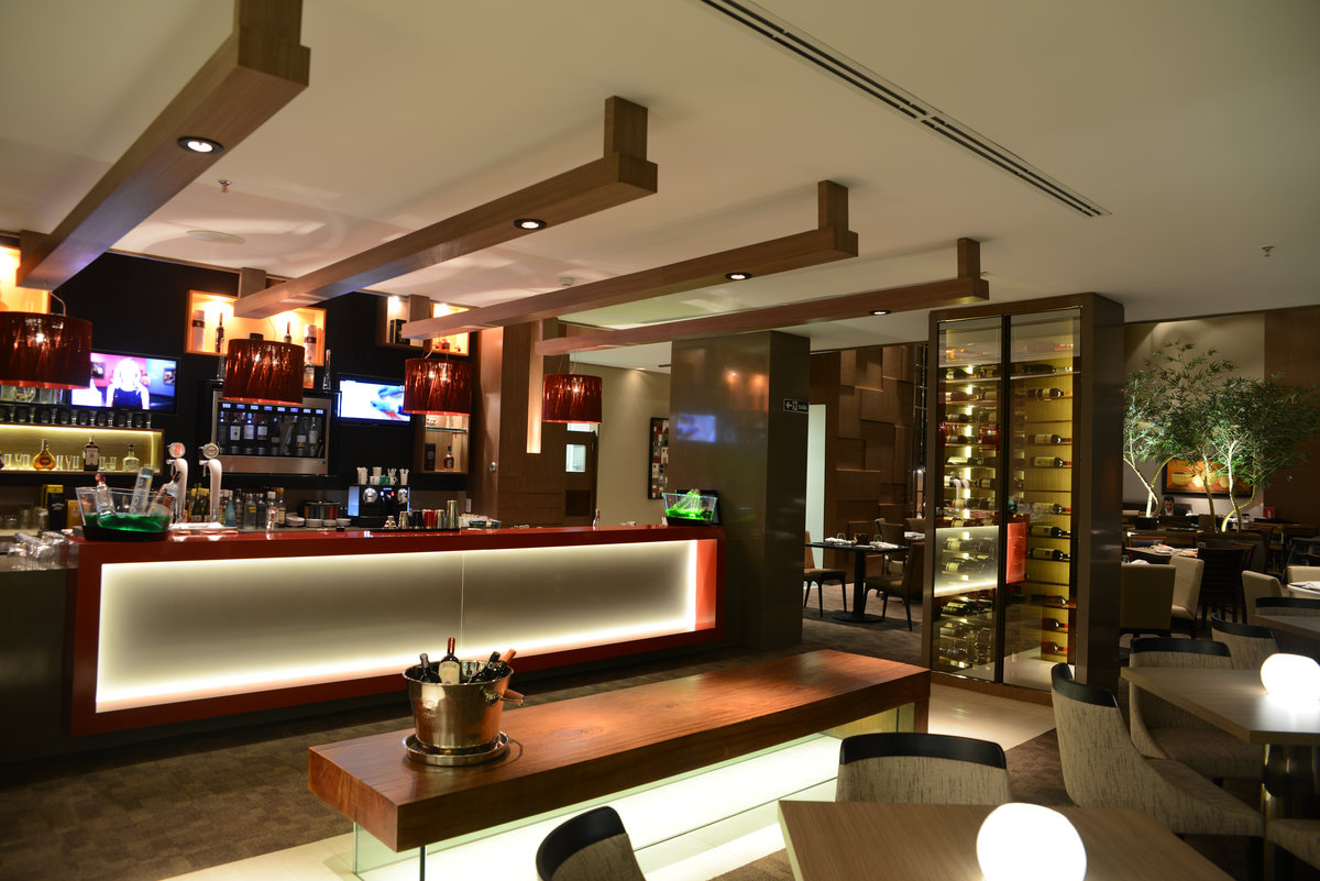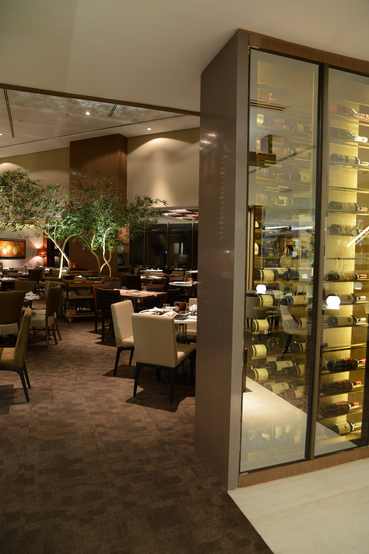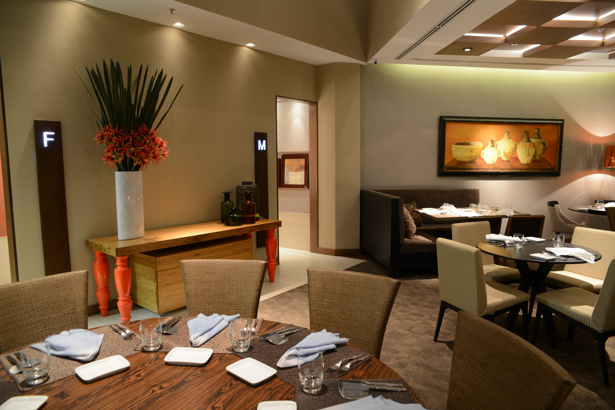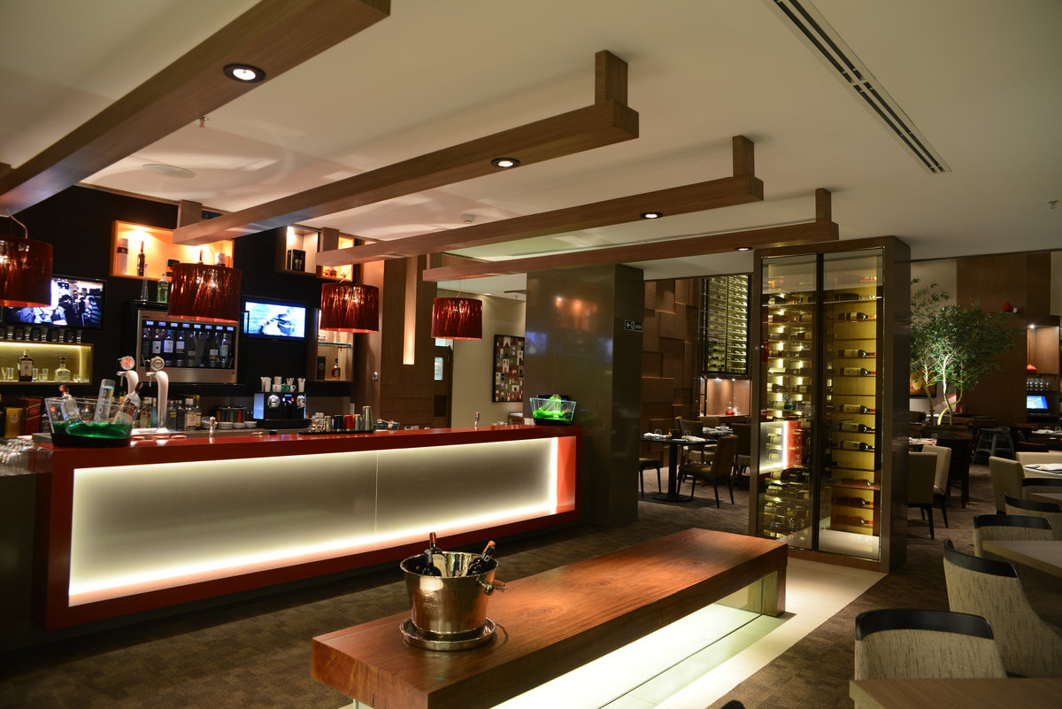 A iluminação indireta, no forro e em detalhes como no corrimão, embutidos cuidadosamente colocados para criar uma atmosfera intimista e acolhedora, tudo pensado para experiências gastronômicas prolongadas.