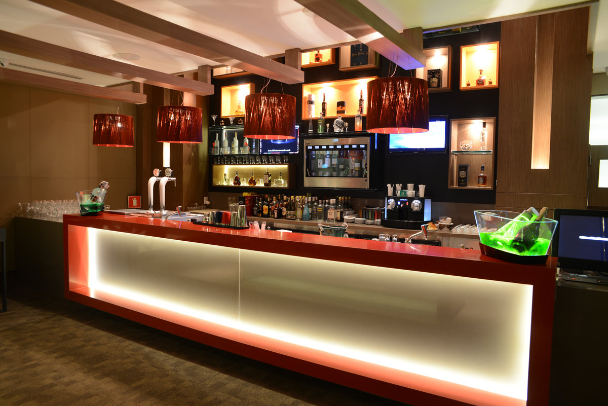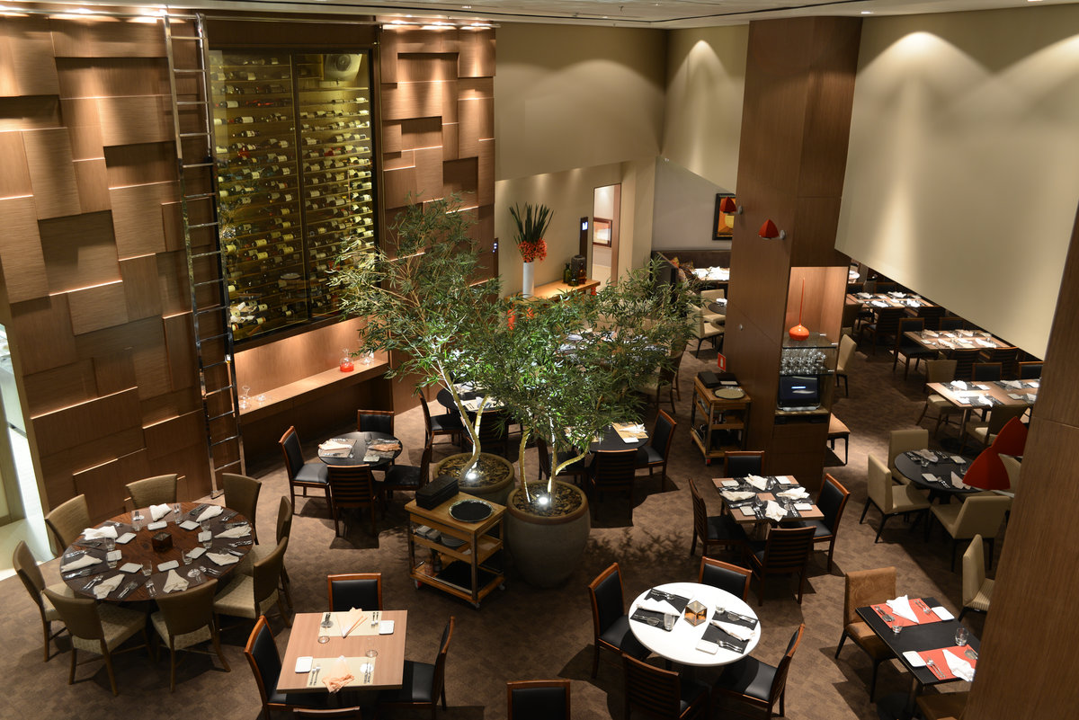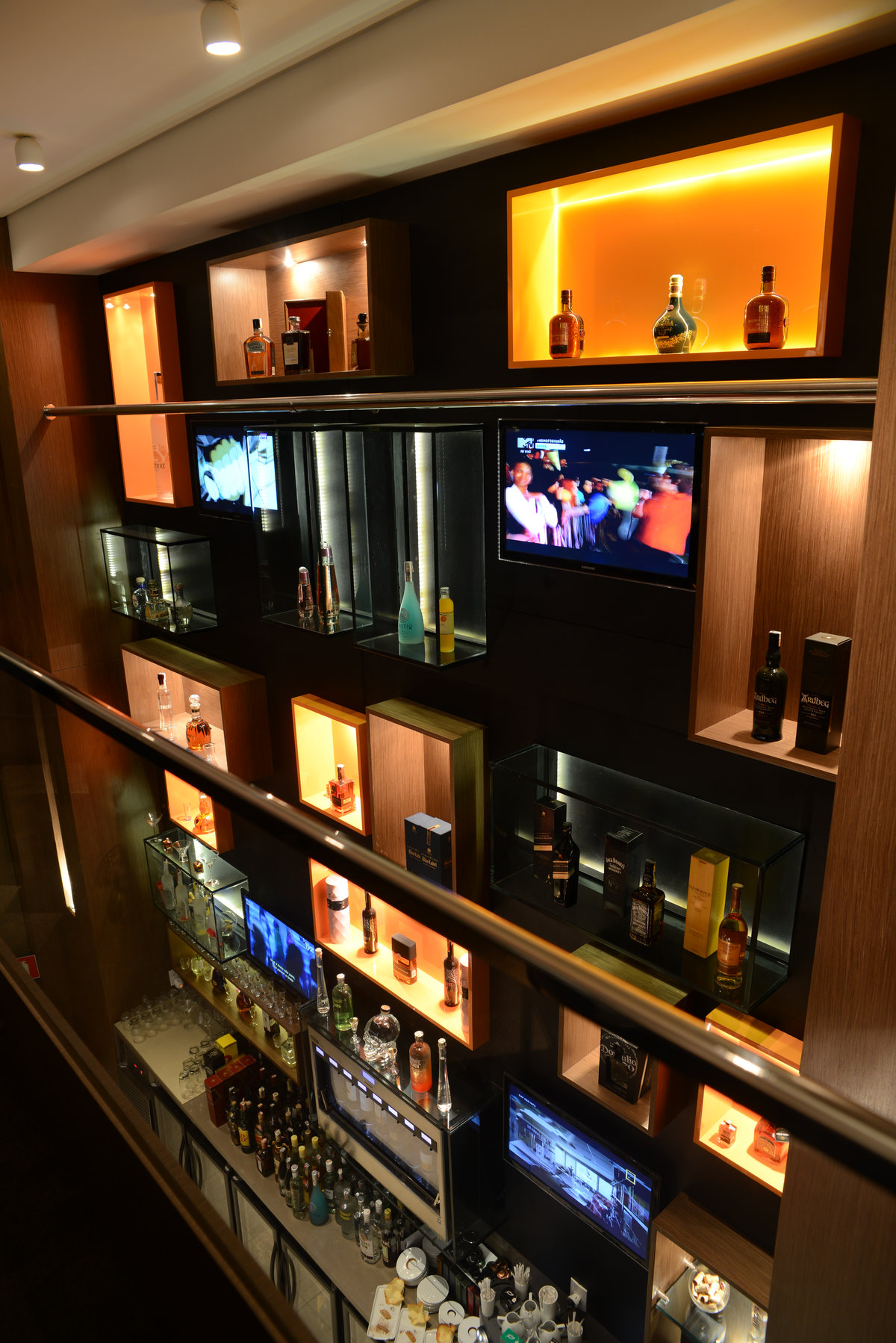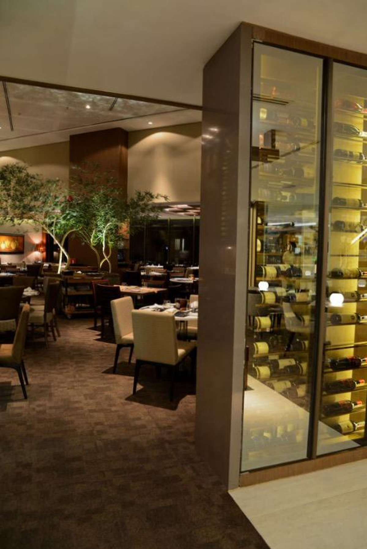 A iluminação indireta, no forro e em detalhes como no corrimão, embutidos cuidadosamente colocados para criar uma atmosfera intimista e acolhedora, tudo pensado para experiências gastronômicas prolongadas.