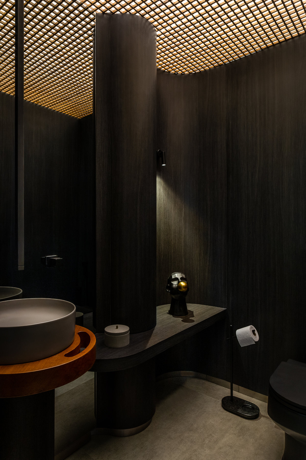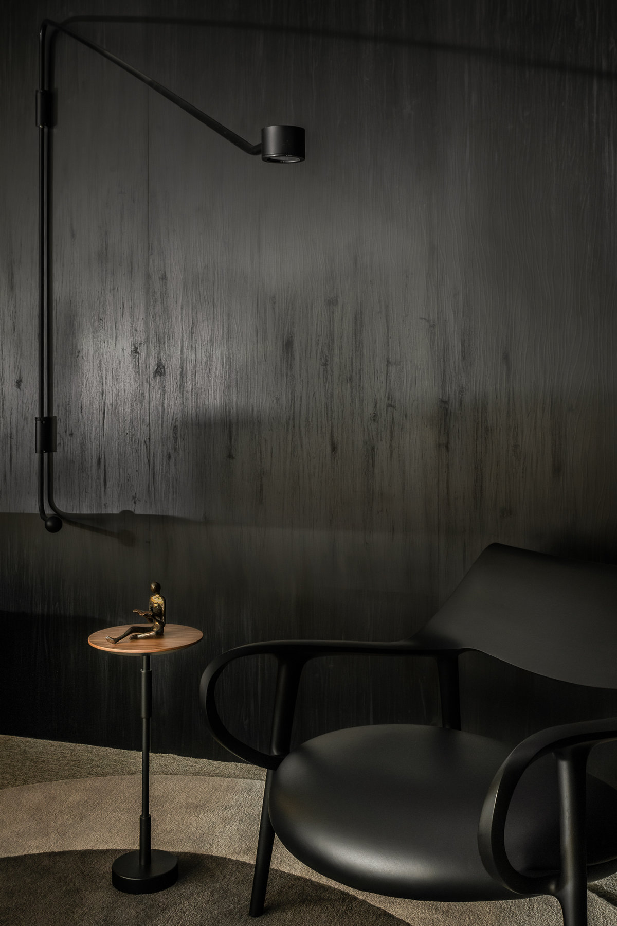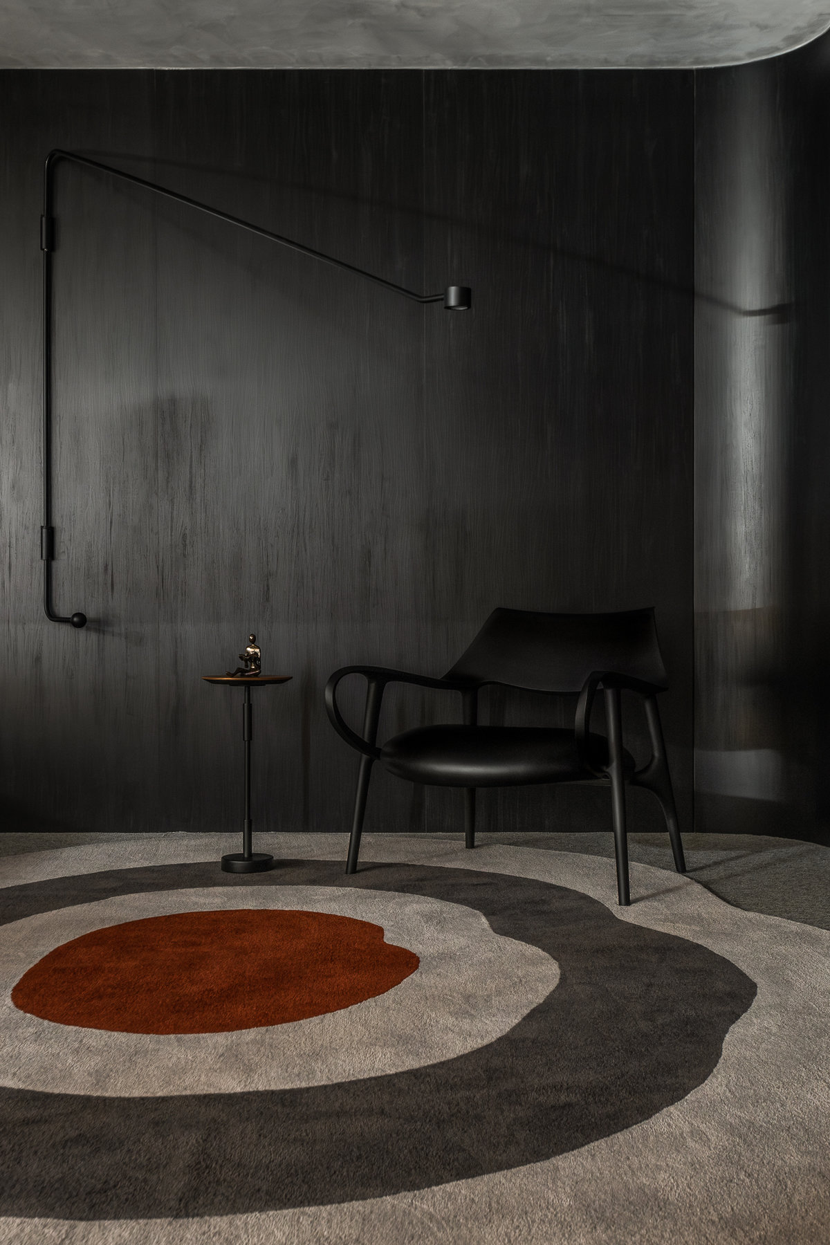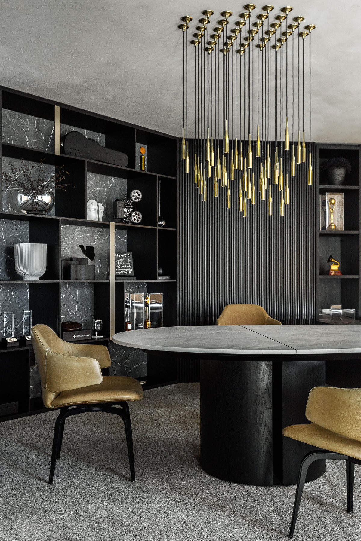 A paleta de cores sóbrias, com predominância de tons escuros e neutros, contrasta harmoniosamente com os toques dourados como da luminária assinada que se destaca no centro do ambiente, conferindo imponência e requinte. O mobiliário assinado combina o contemporâneo e conforto: poltronas em couro caramelo, sofá de linhas orgânicas e mesa com tampo claro e base robusta trazem equilíbrio visual e sofisticação.