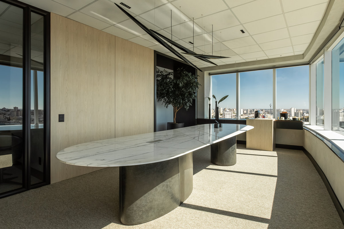 Projetos feitos para encantar! Criada especialmente para a sala de reuniões do cantor Alexandre Pires, a Mesa AP traduz elegância, força e sofisticação em uma composição de três elementos: tampo, base cilíndrica e base oval. Com tampo em mármore branco de veios delicados e bases revestidas em couro, seu design equilibra imponência e leveza, refletindo personalidade e o estilo Sandra Oliveira: Mesa APN