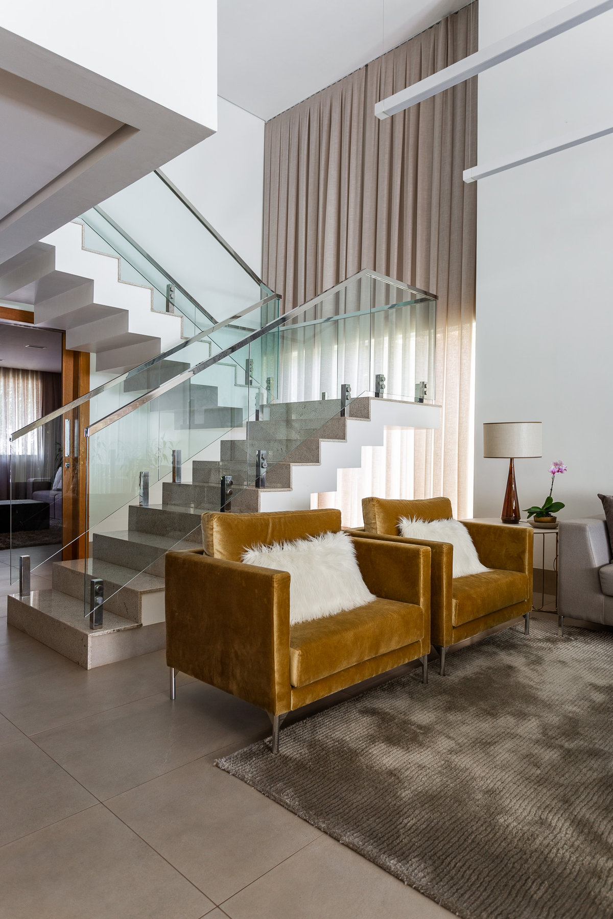 A paleta neutra, as texturas — do veludo mostarda ao linho das cortinas — e a luz natural criam um ambiente leve e acolhedor.